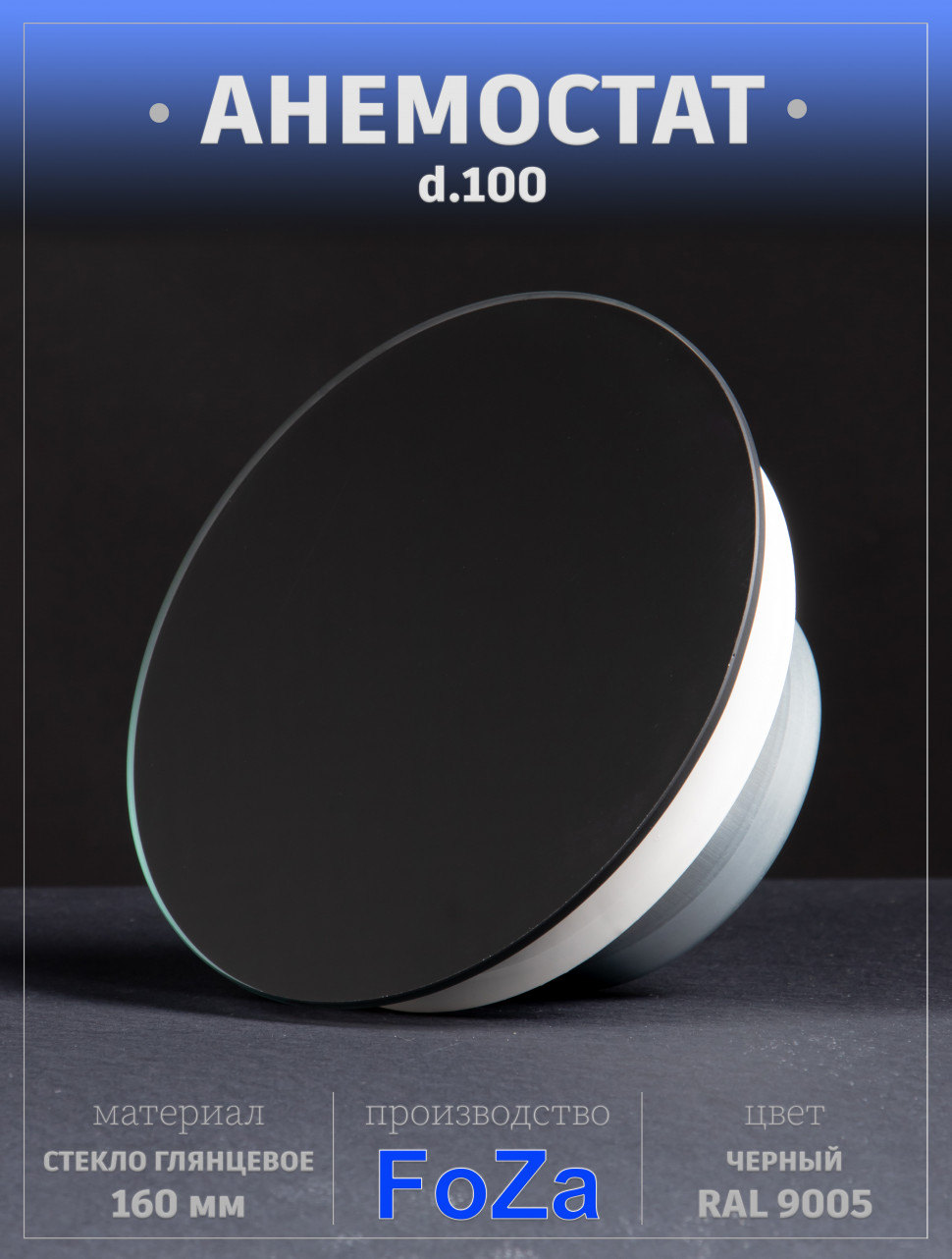 Анемостат со стеклянной внешней частью FOZA D 100 мм. Глянцевое стекло. Чёрный. RAL 9005. Круглый