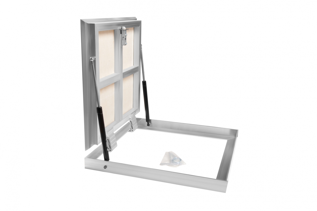 Напольный люк для ревизии, незаполняемый, с амортизаторами и фиксирующими элементами.