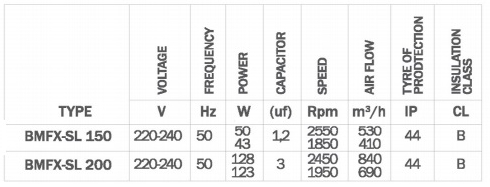 - Вентилятор изготовлен из пластика (модели BFMX 100 – BFMX 200), а у моделей BFMX 250 и BFMX 315 стальной корпус покрытый электростатической порошковой краской.