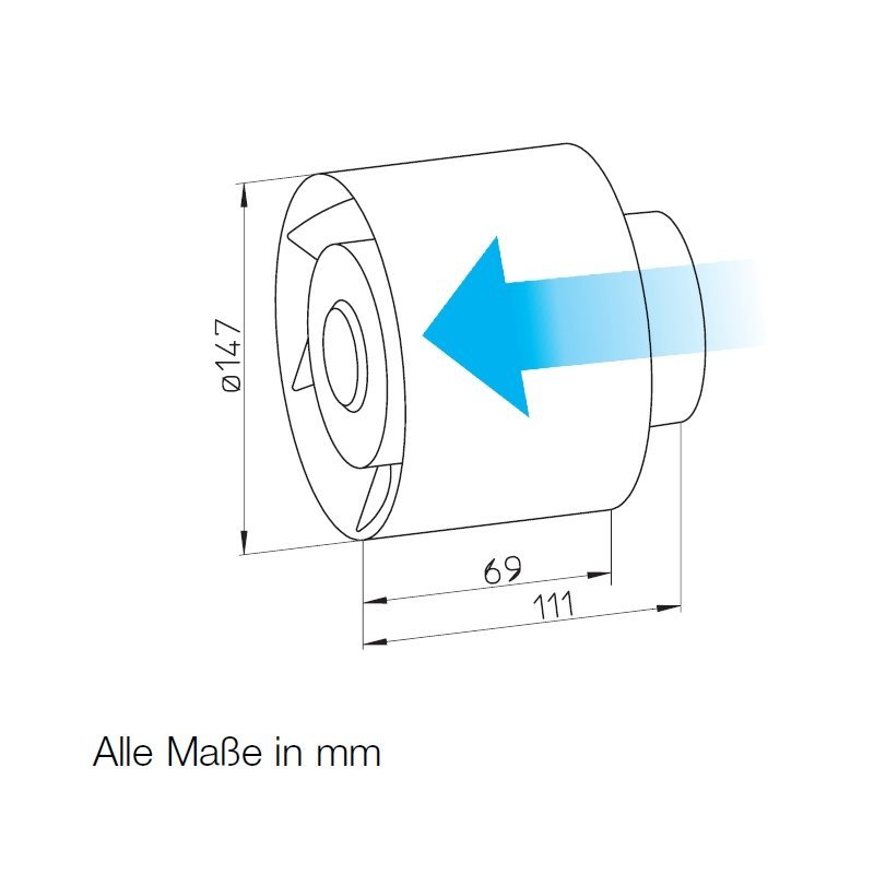 Вентилятор, монтируемый в воздуховод, осевая конструкция, прямой привод. Вставка из пластика с гладкими торцами, предназначена для вставки в трубы номинальным диаметром 150 мм. Крыльчатка с 5 профилированными пластиковыми лопатками, отличается высоким КПД. Двигатель переменного тока с расщеплёнными полюсами и системой защиты от перегрева в режиме непрерывной эксплуатации, имеет не требующие обслуживания шариковые подшипники с запасом смазки, рассчитанным на длительный период эксплуатации. Двигатель реверсивный.